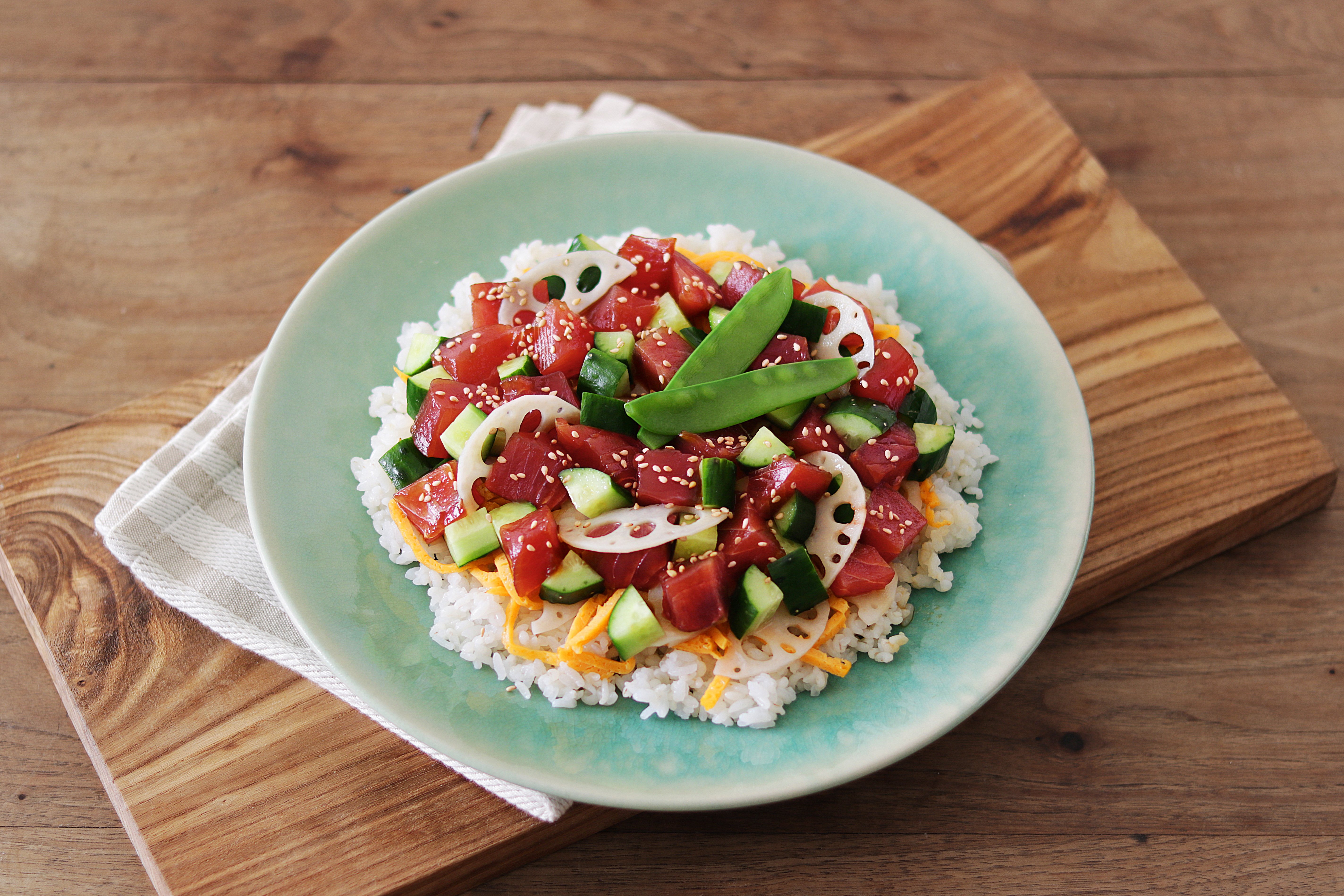 大きめの皿に1のごはんを盛りつけ、上に錦糸卵を散らしたら、かつお・きゅうり・蓮根をのせ、最後に白炒りごま・絹さやをトッピング。