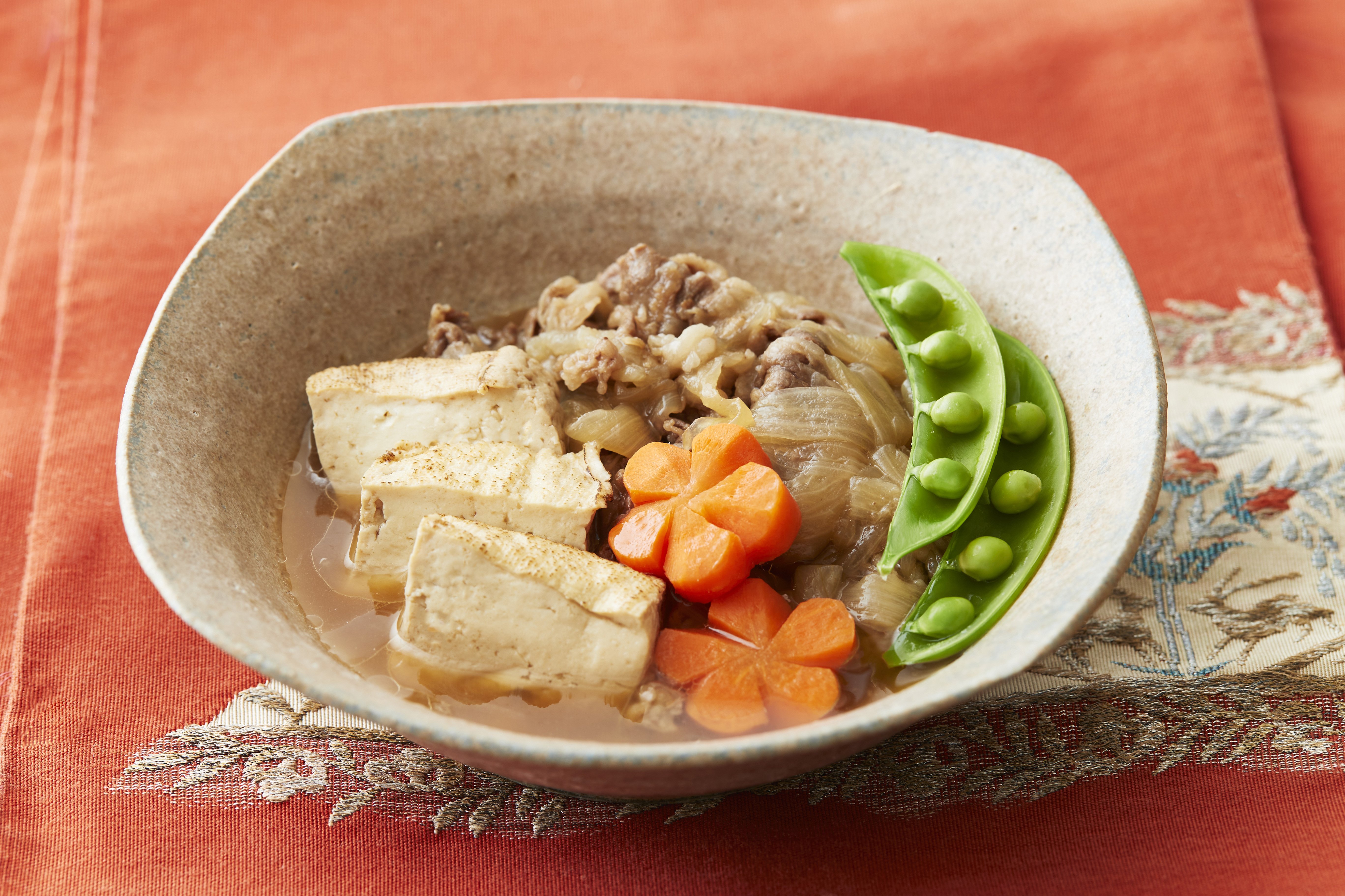 牛薄切り肉は食べやすい長さに切る。豆腐は食べやすい大きさに切る。新玉ねぎは幅7㎜のくし型切り、人参は厚さ5㎜の輪切りにして、花型で型抜き、切り込みを入れてねじり梅の形にする。スナップえんどうは筋を除く。